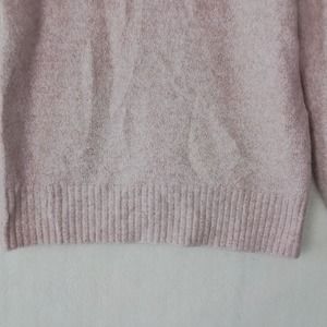 This mock neck knit sweater is soft, cozy, and perfect for cooler weather. It features a mock neck, balloon sleeves, Ribbed wrist/hem. The yarn is soft pink with gold threads throughout that sparkle in the light. This sweater is in excellent preloved condition.