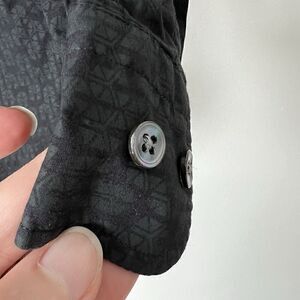 Navy blue and green geometric print long sleeve button down shirt with collar. The buttons are black abalone shell. The shirt is a little faded from washing as it is 100% cotton. Good condition. Please see pictures for material content and details.