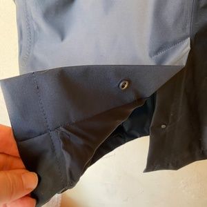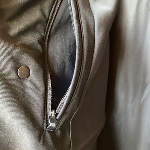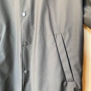 Snap front, snap cuffs, snap vent, two hand warmer pockets, two interior zippered pockets.