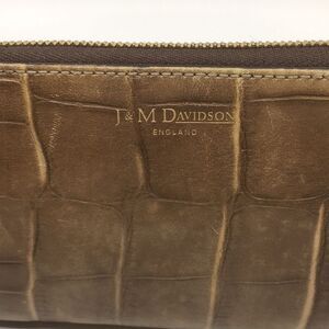 J&M Davidson of England tan leather croc embossed zip around wallet. This zips down one side and the top only. There are some rubs on corners as photographed, and some coin residue in the interior zipper pocket. I believe this piece is vintage and everyone carried change back in the day so this is common on vintage wallets. Minor edge oat missing from zipper pull. Still structurally fine. Such an amazing brand and in B- vintage condition to me. Please see all photos, which include measurements. From my research, this is a luxury brand in England.