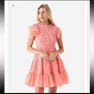 Lightweight mini dress with a smocked bodice and flutter sleeves.