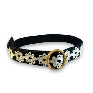 J. MC LAUGHLIN Black fabric belt with ivory embroidery & bamboo buckle 42x1.5”