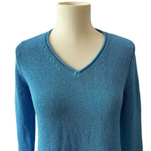 Beautiful blue, womens size X-Small, v neck, long sleeves, open knit, pullover.