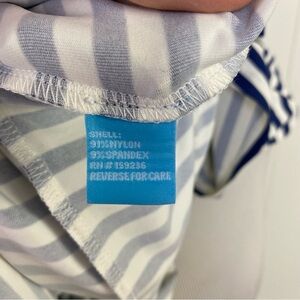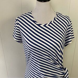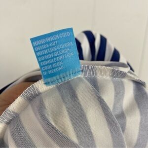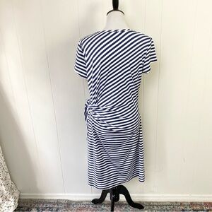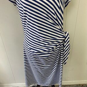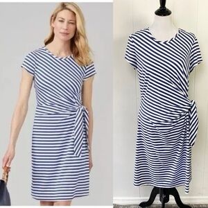 This J. McLaughlin Elora dress is perfect for any casual or travel occasion in the summer or spring season. The knee-length sheath style dress features a round neckline, cap sleeves, and a tie waist accent. It is made of a comfortable and breathable Catalina cloth fabric blend of nylon and spandex. The dress is white in color with navy blue stripes, giving it a classic, preppy, and nautical theme.