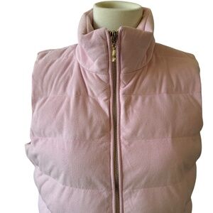 Size Medium, light pink, puffy, faux suede outer, quilted, full zip, zip pockets, stand up collar.