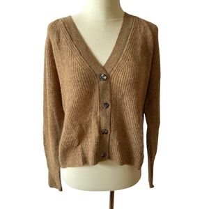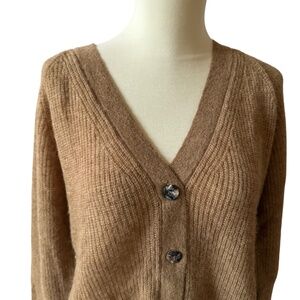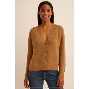 Size Small, neutral dark tan, button front cardigan with v-neck, baby alpaca, merino wool, and nylon blend, slight high low hem, soft, luxury, preppy, academia, neutral, capsule wardrobe, closet staple.
