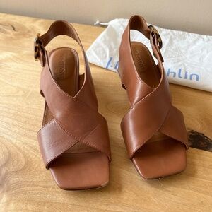 Womens size 6.5, cognac leather upper, adjust tortoise buckle, block heel, square toe, crisscross, slingback, open toe, comes with dustbag.