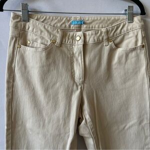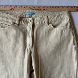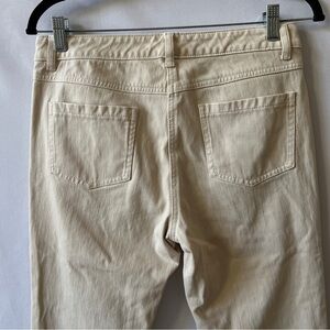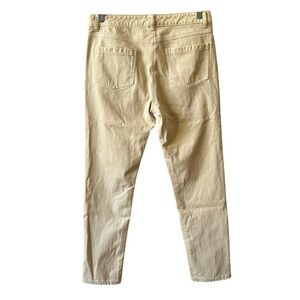 Very light yellow cream color, womens size 6,note spot on left front leg about 14” from cuff, 5-pocket style, casual, stretch, tapered skinny, ankle, cropped length. Effortless, timeless, tailored, versatile, sophisticated, chic, polished.