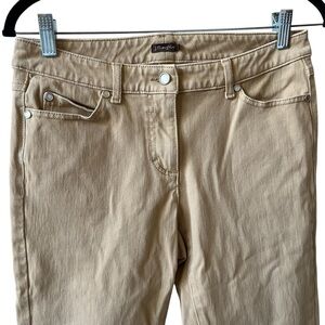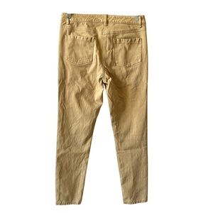 Beige gold color, womens size 6, 5-pocket style, casual, stretch, tapered skinny, ankle, cropped length. Effortless, timeless, tailored, versatile, sophisticated, chic, polished.