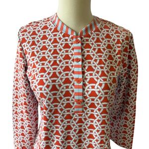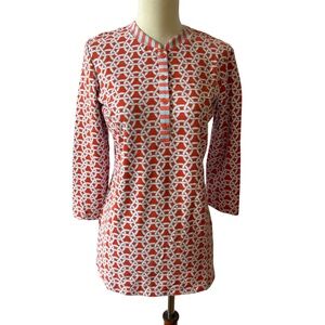 Size XS, coral, white and blue color, signature Catalina Cloth nylon spandex fabric, 4 button polo style, tunic length with side slits, 3/4 sleeves.