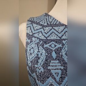 A Flattering Blue Geo Color, Crew Neck, Sleeveless, Keyhole Button Back, Waist length. Soft and Stretchy.
