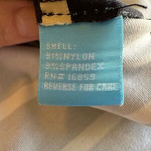 Elasticized waistband. Flat front. Subtle pleat. Circle silhouette. Black with light tan horizontal stripes. Catalina cloth. Stretch material. Resortwear. Snowbird. Country club. Preppy. Casual. Classic. Timeless. Coastal. H