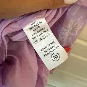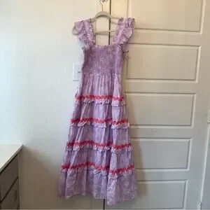 Elegant maxi dress with ruffle details. Features a beautiful purple and pink pattern.