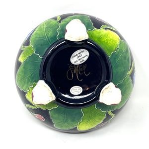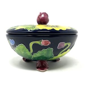 This is no ordinary trinket/candy dish. It has embossed flowers on the top lid both inside and out. It also has embossed flowers both inside and out of the bowl. The handle is a beautiful rose bud. This is a footed dish. The colorful flowers are set against a beautiful blue/black. This is an eye-catcher for sure.