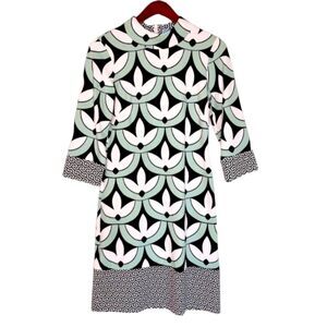 Gorgeous Floral Geometrical Catalina Cloth Dress from J. McLaughlin. This Dress features a sheath style with 3/4 length sleeves and a semi fitted silhouette fit. High neck collar with a hidden zipper at back neck. All over fun, retro floral and contrasting geometrical print design in Mint Green / Turquoise, White and Black. Darted at bust. Made from J. McLaughlin's signature smooth "Catalina Cloth" in a Nylon and Spandex knit blend fabric construction.