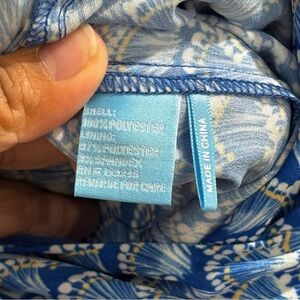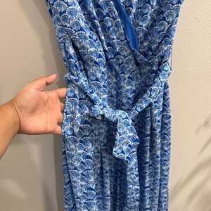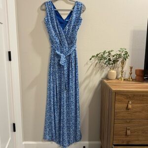 Chic and effortlessly stylish, this J. McLaughlin Hermione Jumpsuit features a breezy blue printed fabric with a flattering V-neckline, wide-leg silhouette, and self-tie belt at the waist. Made with comfort in mind, it includes side pockets and a lightweight, flowy drape perfect for warm weather or vacation wear. Size 10 with approx 36” chest and 36” inseam. A polished one-piece look that’s both comfortable and elegant.
