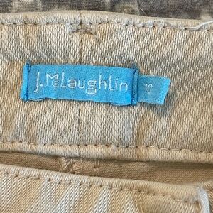 These J McLaughlin pants are a versatile option for women size 10 in a classic beige color. Made from a comfortable stretch cotton denim blend with spandex for added comfort and flexibility, they feature a solid pattern and a zip closure for a secure fit. Perfect for travel and casual occasions, these pants are machine washable for easy care and have a flat front design with pockets for added convenience. The timeless style and quality construction make these pants a great addition to any wardrobe for all seasons.