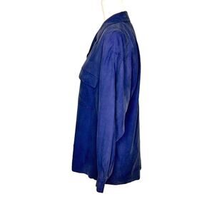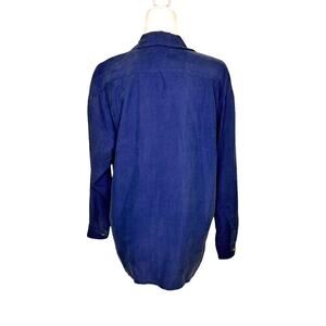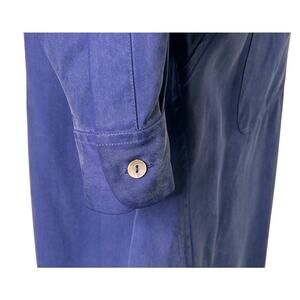 J. McLaughlin Blue 100% Silk Peachskin Button Down Long Sleeve Blouse. The blue is between a navy and royal blue. White pearlescent buttons. Working breast pockets. There is one tiny mark at the very top by the button loop as shown in the last picture. Size Medium. Measurements taken laying flat: