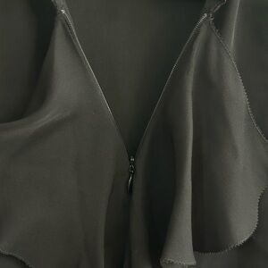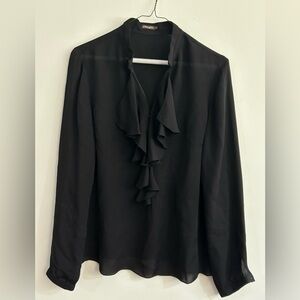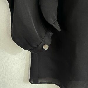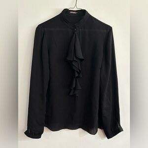 Excellent pre-owned condition, no flaws. 100% silk blouse from J. McLaughlin. Solid black. Front ruffle detail with a hidden 1/4 zipper in the ruffle. Can be worn open as a v neck or closed. Long slight balloon sleeves with button cuffs.