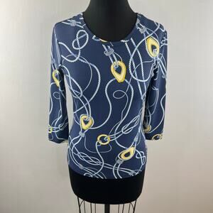 J. McLaughlin 3/4 Sleeve Top Blue Yellow Print Round Neckline Stretch Size XS