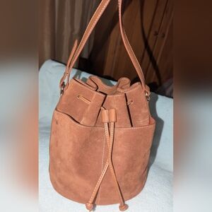 Chic suede shoulder bucket bag with drawstring closure. Two pockets on front. One slip pocket inside. Adjustable crossbody strap. Bag is like new never used. Perfect for daily wear. 9"-9"-6. 25"