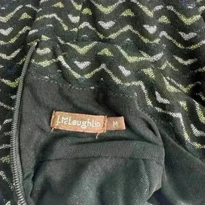 Add a touch of elegance to your wardrobe with this J. McLaughlin black top featuring a gold silver scroll print. The sleeveless blouse has a crew neckline and a zip closure, making it perfect for any occasion, from formal to casual. The top is made of a knit fabric consisting of polyester, cotton, and modal, and it is easy to care for. It also has a metallic lining that adds a glamorous touch to the overall look. The blouse comes in a regular fit and is available in size M. It is perfect for the fall, winter, and spring seasons and is suitable for travel, weddings, parties, cocktails, and business events. The button and zipper accents give the top a stylish edge, and the collarless design adds a touch of sophistication.