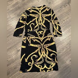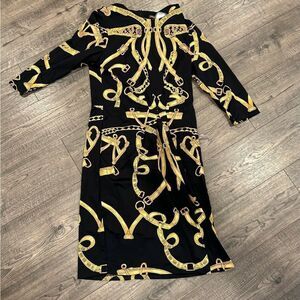 Elevate your wardrobe with this stunning dress. Featuring a bold black and gold chain print, this dress is perfect for making a statement. Ideal for any occasion, it combines and style effortlessly.