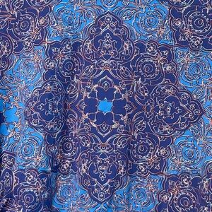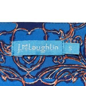 Like new condition FLAWLESS J. McLaughlin Blue Astor Tile Print Dress is a knee-length, form-fitting dress with a round neckline and three-quarter length sleeves. It features an all-over blue tile print pattern. The dress appears to be made of a stretchy material, and it has some ruching at the waist.