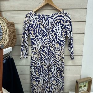 Classic and chic J. McLaughlin dress featuring a bold blue and tan paisley print. Made with a soft and stretchy fabric blend for a flattering fit, perfect for day-to-night style. Features 3/4 sleeves and a boat neckline.