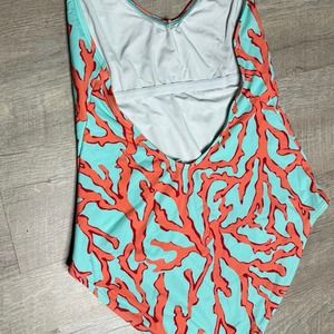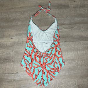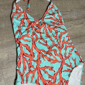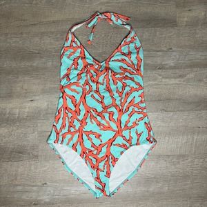 J. McLaughlin Blue Teal Coral Print Halter One Piece Swimsuit Low Back Size 12