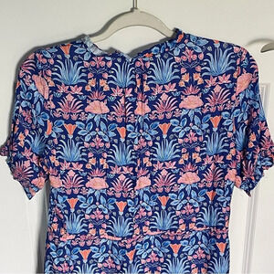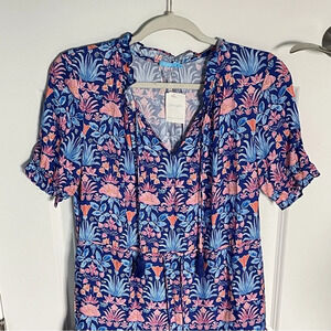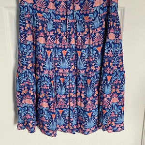 Charming floral midi dress. Features a vibrant blue and pink pattern. Short sleeves and a tiered skirt. Perfect for any occasion. Purchased here and never worn. Clearing out my wardrobe to streamline my look.