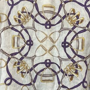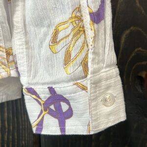 J McLaughlin brand button up shirt. Size 8. White with gold & purple graphics. Chains & Straps. Collared. Long sleeves. Versatile top for office or casual wear. Semi sheer material. Relaxed fit. Preloved. Please see all photos for condition.