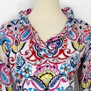 J. McLaughlin Catalina Cloth 3/4 Sleeve Ruffle Neckline Top Blouse Multi | M