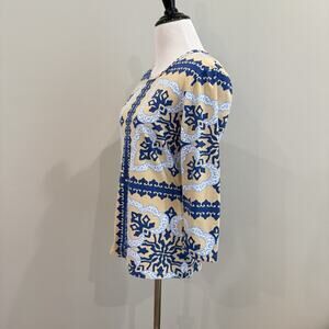 J. McLaughlin Catalina Cloth Top Women’s Size M Tan Blue Print Stretch Shirt