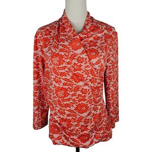 This elegant J.McLaughlin top features a striking red and white floral lace pattern. Made from a combination of stretchy nylon and spandex, it offers comfort and style for professional settings. Ideal for adding a pop of color to any wardrobe.