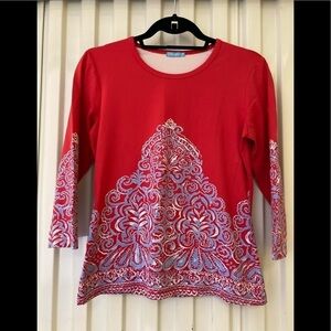 J. McLaughlin Catalina cloth Top. Small . Measurements: underarm to underarm 18”, sleeves 16”, length 23”. Red / blue / white colors . Catalina cloth . Great condition.