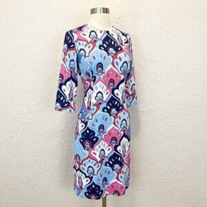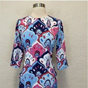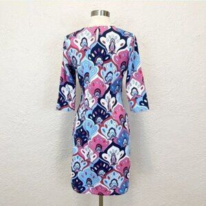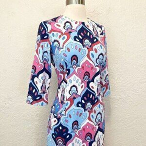 This J. McLaughlin Catalyst Dress in medium size showcases a psychedelic sheath style in pink, blue, and white. The 3/4 sleeves are perfect for any season, and the Catalina cloth provides a comfortable fit.