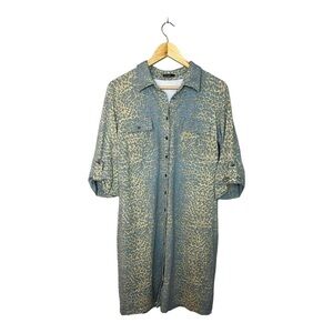 Creamy tan with blue and grey big cat print. Collared Safari Dress with roll tab sleeve. Button Front Chest Pockets 91% nylon, 9% spandex Catalina Cloth. Excellent Preowned condition Measures approximately: Bust 22” Length 39”
