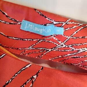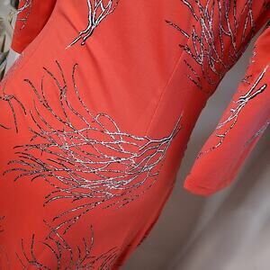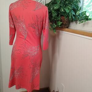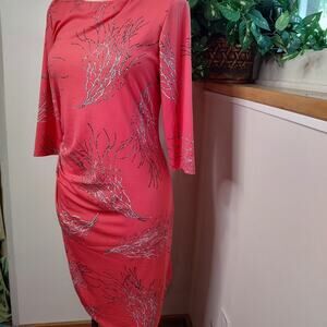 Gorgeous coral dress with branch-like whimsical design and rouched side. Comfortable signature J. McLaughlin fabric is stretchy and slightly thick for a very nice fit and feel. In excellent, like new condition.