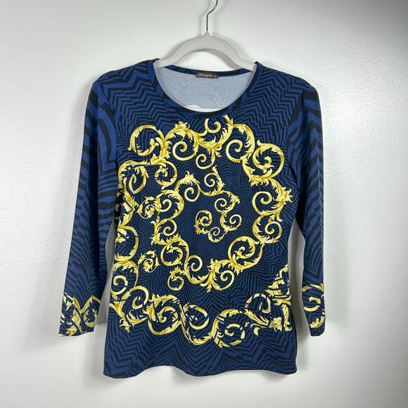 J. McLaughlin Dark Blue Black Gold Flourishes 3/4 Sleeve Blouse Size Small