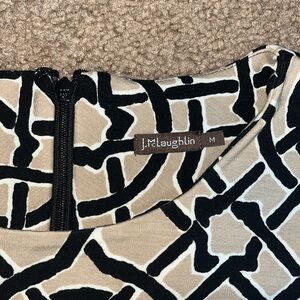 J. McLaughlin Devon 3/4 Sleeve Crew Neck Catalina Cloth Sheath Dress Black Tan Scribe Medium. Relaxed Sheath silhouette. Rounded neckline. Unlined. Rayon nylon blend. 3/4 sleeve. Back zip. Knee length. Stretch. Princess seams for shaping. Approx measurements: 18“ pit to pit, 17“ waist, & 35“ length. Great pre-owned condition. No stains/flaws. Smoke/pet free home. Offers welcome. Bundle & save. Ship same/next day. Packaged w/ care.