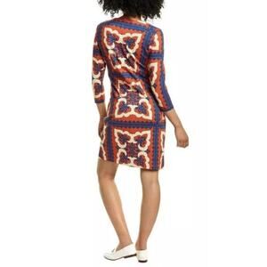 J. McLaughlin Devon Pinwheel Patch Print Dress in Navy Multi. Size S / Small. Features crew neck, 3/4 sleeves, pinwheel patch print, hidden back zipper closure, sheath silhouette, and mini length. 78% Rayon, 14% Nylon, 8% Spandex. Excellent pre-owned condition, no flaws.