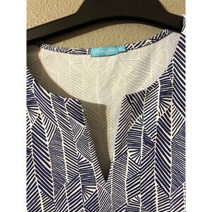 This pretty dress is from J. McLaughlin in a misses size extra small. Soft and stretchy, made of 91% nylon and 9% spandex. Hand washable. Pullover style with stretch. Unstretched, measured from seam to seam across the front:bust is 17 inches across