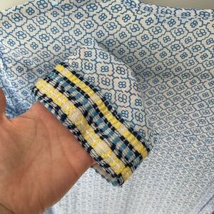 Blue & White print with gorgeous yellow and blue embroidery at neckline, cuffs and hemline