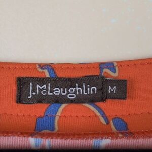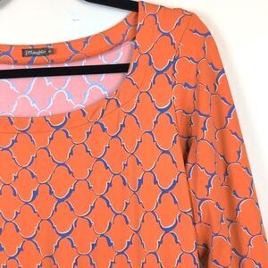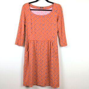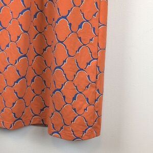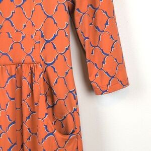 J. McLaughlin Emma Dress in an orange and blue Catalina Cloth Geometric Print with 3/4 length sleeves. This classic dress features a scoop neck, wrinkle resistant Catalina Cloth, 3/4 length sleeves, knee length, gathers at the front waistband, 2 front pockets, and shaping darts in the back for a feminine fit. 91% nylon and 9% spandex. Size Medium.