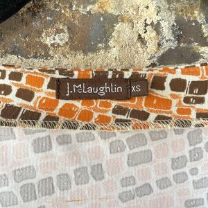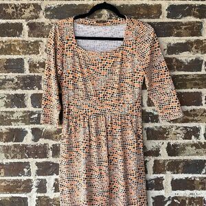 J. McLaughlin Emma dress. Three quarter length long sleeves. Slightly square neckline scoop neck. Has pockets! Orange, brown and cream geometric print. The best fabric, the iconic Catalina Cloth, super stretchy and comfortable. Lightweight spandex knit, wrinkle free and machine washable. Pleat details at the waist. Perfect for work, career wear. Retro mod style pattern geometric print.