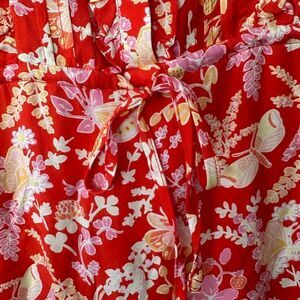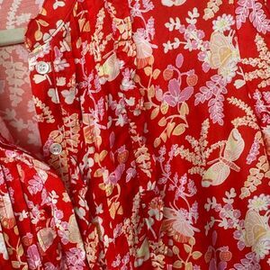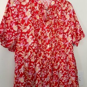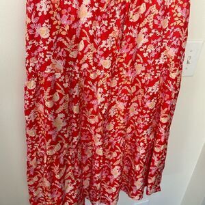 Relaxed fit floral midi dress with partial button and drawstring waistband. Tiered bottom half with slip underneath. Lightweight, relaxed fit in EUC.