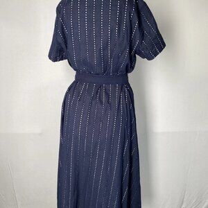 Elevate your wardrobe with this beautifully tailored midi dress from J. McLaughlin. The “Kalinda” features delicate eyelet-embroidered stripes for subtle texture, a self-tie sash to cinch the waist, and a structured A-line silhouette that captures ease with polish. The navy-blue version (also available in other hues) delivers sophisticated style that carries effortlessly from office to dinner dates.