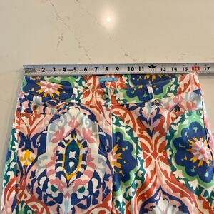In good used condition. No holes or stains. Colorful pattern. 27" inseam. Zipper fly with a button. Mid rise. Women's size 8.