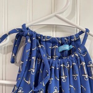 Keywords: J. McLaughlin, halter dress, anchor print, sleeveless dress, casual dress, nautical dress, summer dress, vacation dress, blue dress, XS dress, women's dress, beach dress, resort wear, cruise wear
